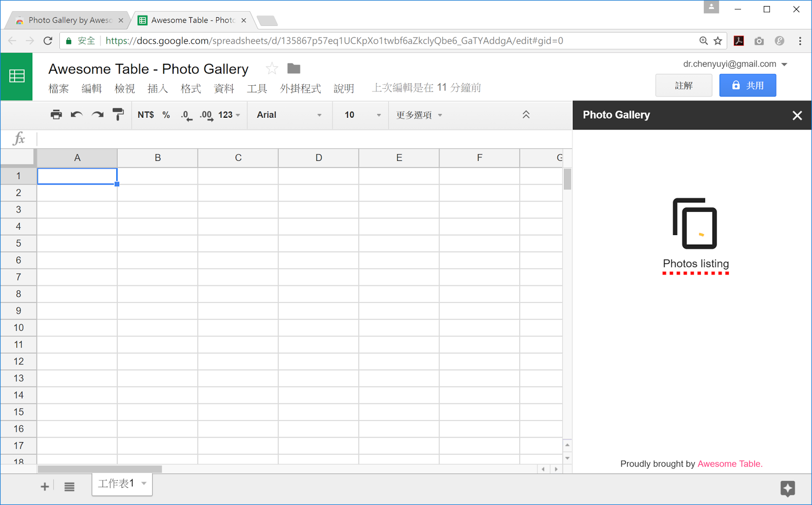 Awesome Table提供一個Google Sheet的外掛程式「Photo Gallery」,可以讓我們指定某個雲端硬碟資料夾讓它自動抓取裡面的圖片檔案資料到Google Sheet,這樣的工具可以讓我們很快做出一個相簿列表功能呈現於網頁上。